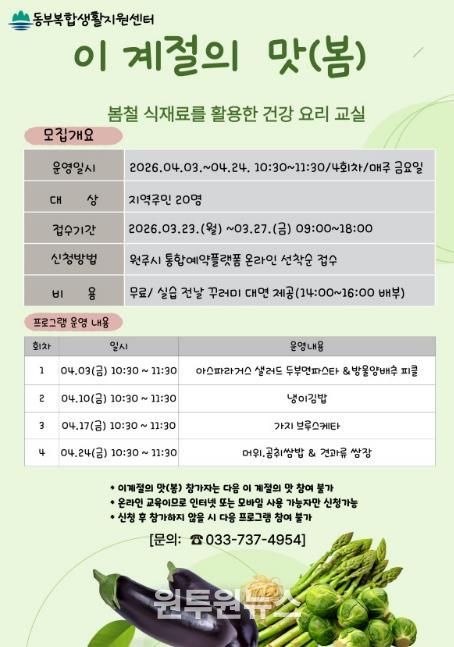 (원투원뉴스) 원주시 동부복합생활지원센터는 오는 23일부터 ‘이 계절의 맛 (봄)’ 건강 요리 교실 프로그램 참여자를 모집한다.