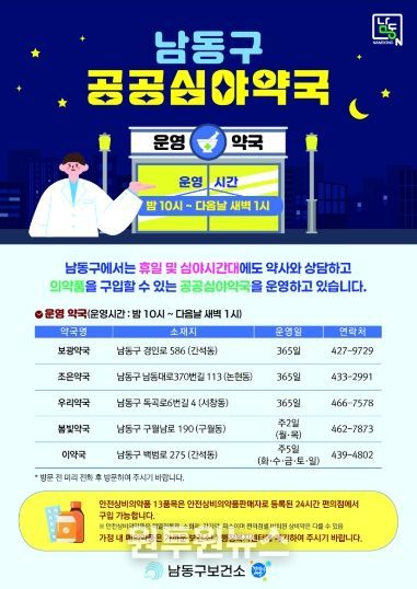 공공심야약국 현황 및 운영시간 등 자세한 사항은 남동구보건소 홈페이지에서 확인할 수 있다.