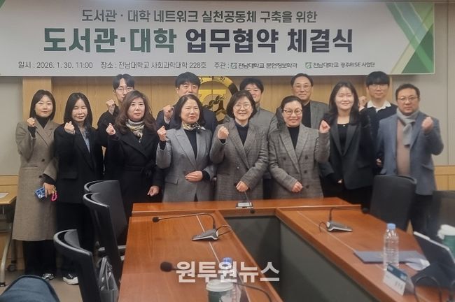 17일 전남대에 따르면 전남대학교 사회과학대학 문헌정보학과는 지난 1월 30일 사회과학대학 228호 회의실에서 광주전남지역대학도서관협의회, 광주광역시교육청중앙도서관, 광주광역시립무등도서관, 광주연구원 AI정책연구센터, 국립아시아문화전당재단 어린이사업본부와 ‘도서관-대학 네트워크 협의체’ 구축을 위한 업무협약을 체결했다.