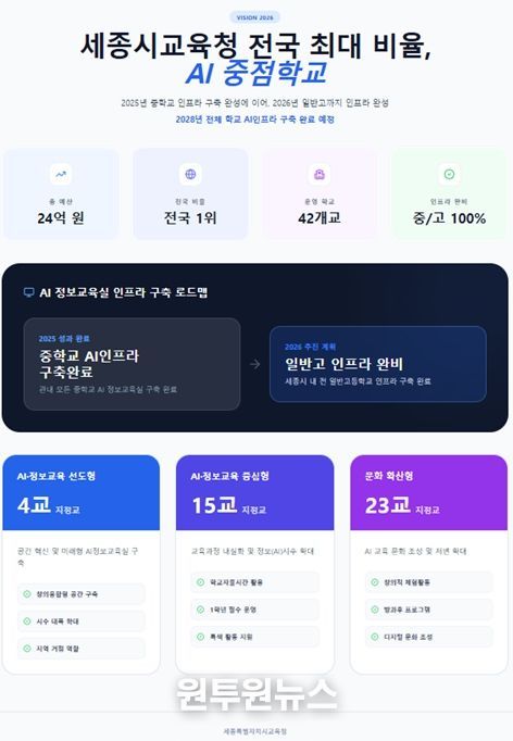 세종시교육청은 2026년 3월부터 2027년 2월까지 관내 초·중·고등학교 42개교를 ‘AI 중점학교’로 지정하고 총 24억 원의 예산을 투입하는 ‘2026년 AI 중점학교 운영 계획’을 발표했다.