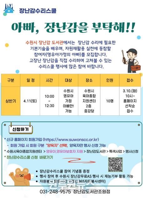 수원시육아종합지원센터 관계자는 “고장 난 장난감을 수리해 폐장난감을 줄이고 환경보호를 실천하는 교육”이라며 “아버지가 아이와 함께 소통하며 육아에 적극적으로 참여하는 문화가 확산되는 계기가 되길 바란다”고 말했다.