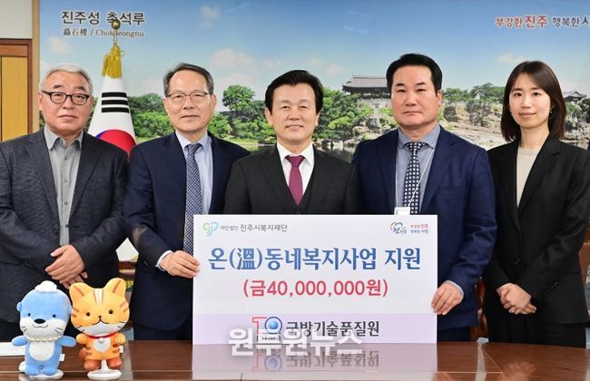 (원투원뉴스) 국방기술품질원은 지난 17일 시청 기업인의 방에서 지역사회 어려운 이웃을 돕기 위해 성금 4000만 원을 진주시복지재단에 기탁했다.