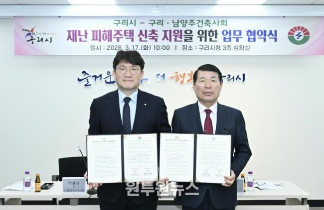 (원투원뉴스) 구리시는 지난 17일 구리·남양주건축사회와 재난 피해 주민의 신속한 주거 안정을 지원하기 위한 '재난 피해 주택 신축지원 업무협약'을 체결했다.