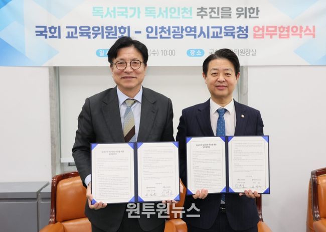 (원투원뉴스) 인천광역시교육청은 18일 도성훈 교육감과 김영호 교육위원장을 비롯해 양측 관계자들이 참석한 가운데, 국회 교육위원회와 ‘독서국가 독서인천’ 추진을 위한 업무협약을 체결했다.