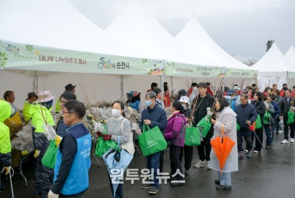 이번 행사는 전라남도, 순천국유림관리소, 순천농협, 순천시산림조합과 협력하여 마련됐으며, 대추·살구·자두·복숭아 등 과실수와 황칠, 서향(천리향), 미니화분 등 총 7종 21,000주의 묘목을 준비해 순천시민 3,000명에게 1인당 7주씩 배부했다.