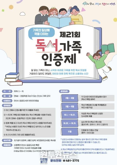 (원투원뉴스) 안산시 성포도서관은 오는 10월까지 가족의 일상에 책을 더하는 ‘독서가족인증제’를 운영한다고 19일 밝혔다.