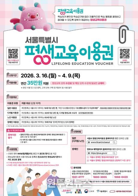 (원투원뉴스) 서울 강서구는 4월 9일까지 ‘2026년 평생교육이용권’ 지원 대상자를 모집한다.