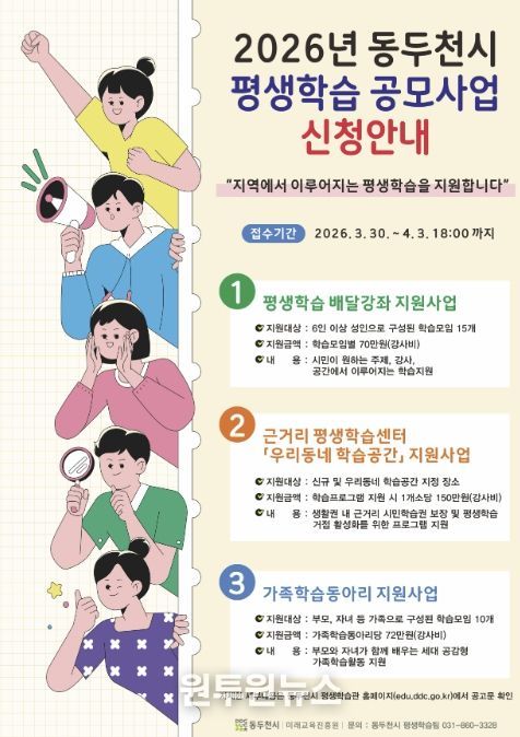 (원투원뉴스) 동두천시는 시민들의 자발적인 학습 문화를 확산하고 지역 평생학습 공동체를 활성화하기 위해 ‘2026년 평생학습 공모사업’ 신청을 오는 3월 30일부터 4월 3일까지 접수한다고 밝혔다.
