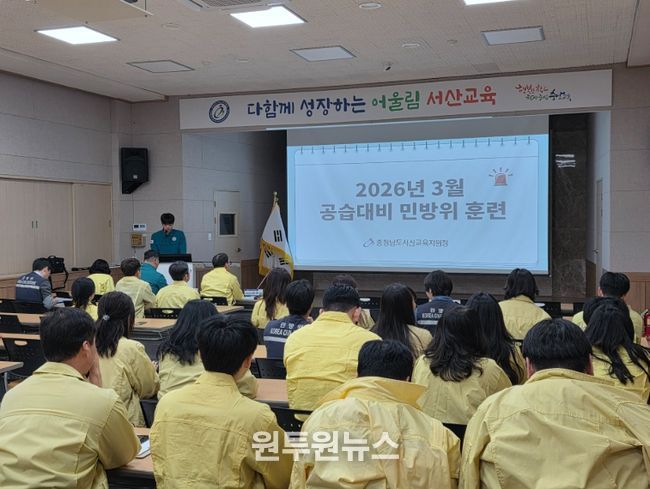 (원투원뉴스) 서산교육지원청은 공습 상황에 대비한 위기 대응 역량을 강화하기 위해 18일 '2026년 공습 대비 민방위 훈련'을 실시했다.