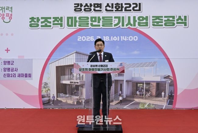 (원투원뉴스) 양평군은 지난 18일 창조적 마을만들기 사업으로 조성한 ‘신화2리 마을회관’ 준공식을 개최했다. 이날 행사에는 전진선 양평군수를 비롯해 지민희 양평군의회 부의장, 송진욱 군의원, 마을 주민 등 100여 명이 참석해 준공을 축하했다.