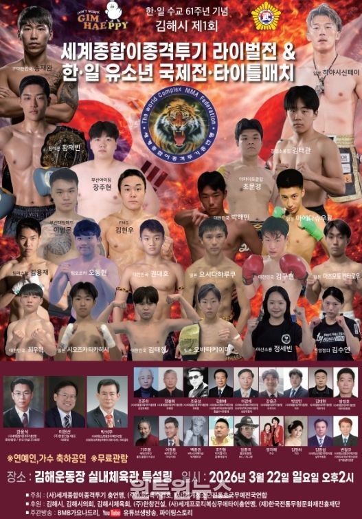 사단법인 세계종합이종격투기총연맹(회장 강용석)과 사단법인 세계청소년전통호국무예전국연합(대표 박석우)이 공동 주최·주관하는 이번 대회는 한국 선수 16명과 일본 선수 6명 등 총 22명의 선수가 참가해 다양한 체급의 경기를 펼친다.