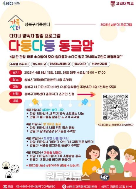 이승로 성북구청장은 “다자녀 양육자들이 서로 공감하고 응원할 수 있는 돌봄공동체 형성에 도움이 되길 바란다”며 “앞으로도 다양한 가족 유형을 지원하는 프로그램을 지속적으로 운영하겠다”고 말했다.