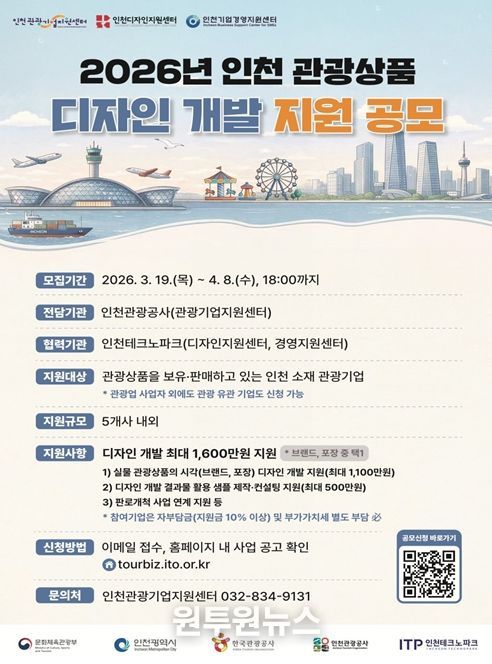 (원투원뉴스) 인천광역시와 인천관광공사는 지역 관광상품의 시장 경쟁력을 강화하고 브랜드 가치를 높이기 위해 '2026년 인천 관광상품 디자인 개발 지원 사업'에 참여할 역량 있는 기업을 오는 4월 8일까지 모집한다고 밝혔다.