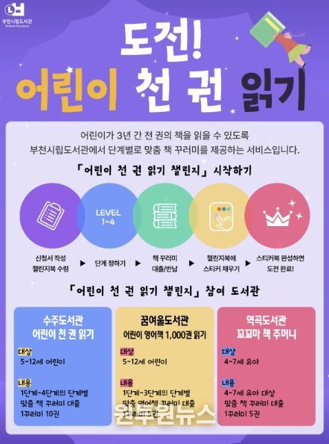 (원투원뉴스) 부천시는 어린이의 체계적인 독서 습관 형성과 도서관 이용 활성화를 위해 기존 수주도서관 중심으로 운영하던 ‘어린이 천 권 읽기 챌린지’를 꿈여울도서관과 역곡도서관까지 확대 운영한다.