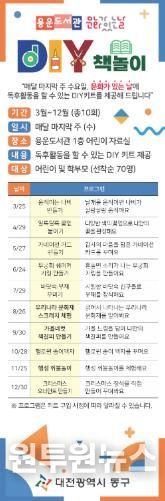 (원투원뉴스) 대전 동구는 매달 마지막 주 수요일 ‘문화가 있는 날’을 맞아, 이달 25일부터 용운도서관에서 ‘DIY 책놀이’ 프로그램을 운영한다고 20일 밝혔다.