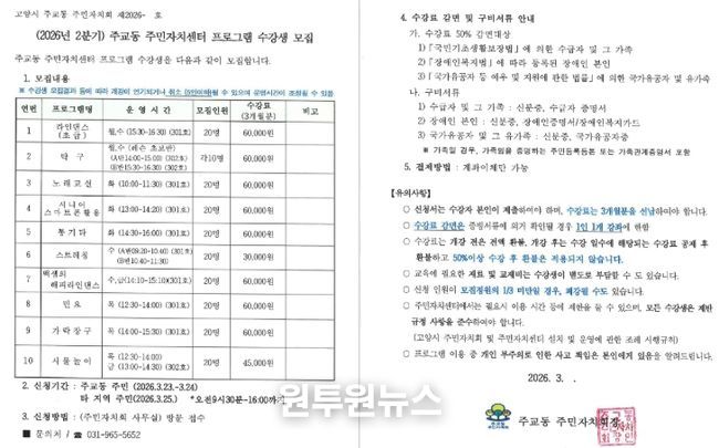(원투원뉴스) 고양특례시 주교동 주민자치회는 오는 3월 23일부터 25일까지, 2분기 주민자치센터 문화강좌 프로그램 수강생을 모집한다.