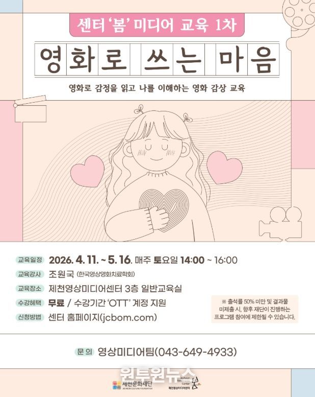 이번 교육은 영화를 매개로 자신의 감정을 돌아보고 타인에 대한 공감 능력을 높이는 프로그램으로, 제천영상미디어센터 3층 일반교육실에서 4월 11일부터 5월 16일까지 매주 토요일 오후 2시, 총 5회차에 걸쳐 진행된다.
