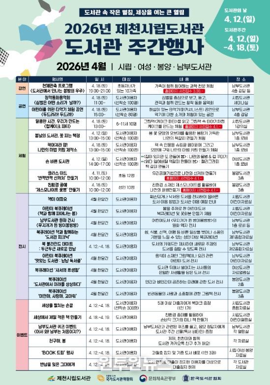 (원투원뉴스) 제천시립도서관은 4월 12일부터 18일까지 2026년 도서관 주간을 기념해 4월 다양한 독서 문화 행사를 개최한다.