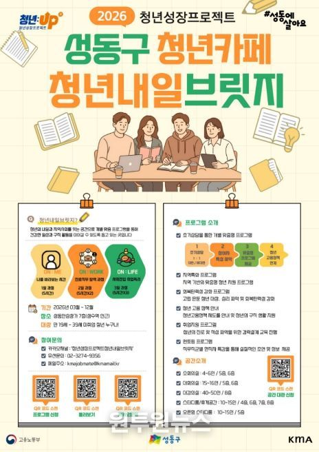 (원투원뉴스) 서울 성동구가 고용노동부 ‘청년성장프로젝트’ 공모에 선정됨에 따라 (사)한국능률협회와 협업해 청년 맞춤형 일상 회복과 성장을 지원하는 프로그램 ‘청년내일브릿지’를 3월부터 운영한다고 밝혔다.