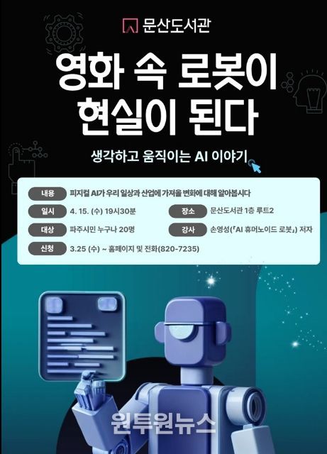 (원투원뉴스) 파주시 문산도서관은 오는 4월 15일 19시 30분, 과학기술 강연 ‘영화 속 로봇이 현실이 된다: 생각하고 움직이는 인공지능(AI) 이야기’를 개최한다.