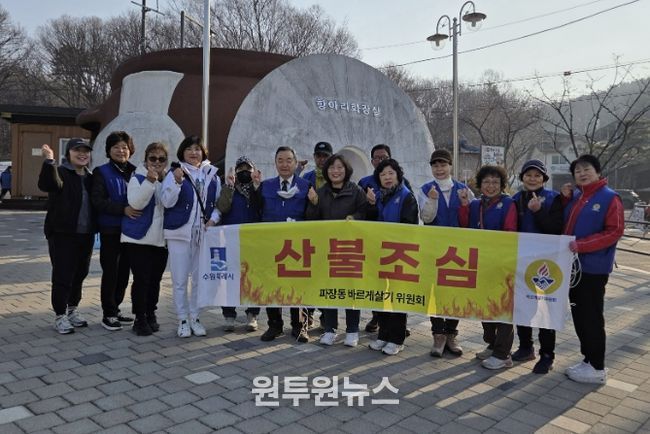 (원투원뉴스) 수원시 장안구 파장동 바르게살기운동위원회가 지난 21일, 파장동 인근 등산로에서 지역 주민들을 대상으로 산불 예방의 중요성을 알리고 안전의식을 높이기 위한 산불방지 캠페인을 실시했다.