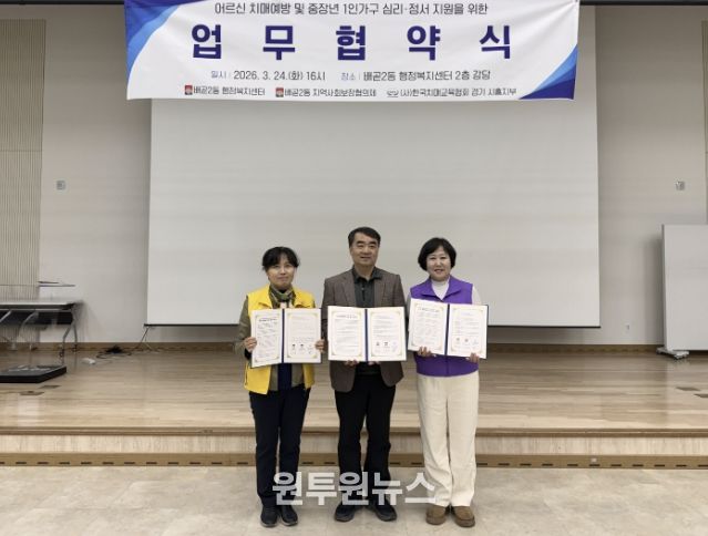 (원투원뉴스) 시흥시 배곧2동 행정복지센터는 지난 3월 24일 행정복지센터 2층 강당에서 배곧2동 지역사회보장협의체, (사)한국치매교육협회 경기 시흥지부와 ‘어르신 치매예방 및 중장년 1인 가구 정서 지원을 위한 업무협약’을 체결했다.