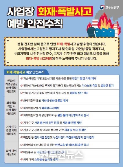 지난 3월 20일 대전시 대덕구 제조업체에서 노동자가 사망한 화재사고가 발생한 바 있다. 고용노동부는 유사한 사고가 발생하지 않도록 ▴작업장 내 가연물 파악 및 안전장소 보관, ▴화재 위험작업 작업계획 수립, ▴용접‧용단 등 화기작업 시 불티 비산 방지 조치, ▴비상구 설치 여부 및 관리 등 기본적인 안전조치 준수 여부를 중점적으로 확인한다.