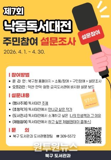 (원투원뉴스) 부산 북구는 오는 4월 1일부터 30일까지 한 달간 2026년 제7회 낙동독서대전 개최를 위한 구민 의견수렴 설문조사를 실시한다고 밝혔다.