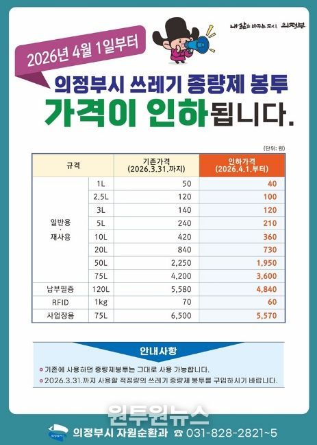 (원투원뉴스) 의정부시는 4월 1일부터 종량제봉투 가격 인하를 예정대로 시행한다고 밝혔다.