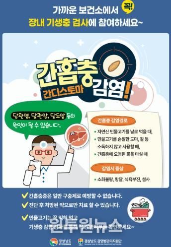 안명기 보건소장은 “민물고기를 반드시 익혀먹고, 칼, 도마 등 조리용 기구는 소독하며 손씻기 등 개인위생 수칙을 철저히 지키는 것이 중요하다”며 “민물회를 즐기는 주민들은 이번 무료 검진에 적극 참여해 조기발견과 예방에 힘써달라”고 말했다.