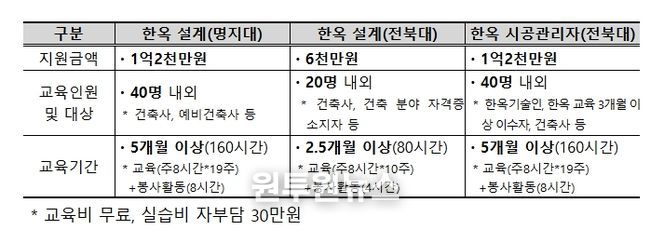 한옥 건축 전문가 양성 지정기관인 명지대와 전북대는 5월부터 매주 토요일(현업 종사자를 위해 주말 수업)에 교육과정을 운영한