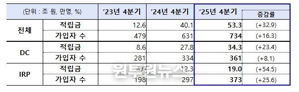 사전지정운용제도(디폴트옵션)는 확정기여형퇴직연금(DC) 및 개인형퇴직연금(IRP) 가입자가 운용지시를 하지 않는 경우 사전에 정한 방법으로 퇴직연금을 운용하는 제도로, ’23.7월부터 시행되어 뚜렷한 증가세를 보이며 ’25년 4분기 기준 적립금 53조 원, 734만 명의 가입자를 보유하고 있다.