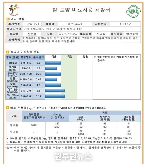 농촌진흥청은 토양환경정보시스템 ‘흙토람’에서 246작물의 비료사용처방서를 제공하고 있다. 작물을 아주심기(정식) 하기 전 토양을 채취해 가까운 농업기술센터에 분석을 의뢰하면 토양 양분 상태에 맞는 퇴비와 액비 사용량을 알려준다. 또한, 농가가 안심하고 퇴비, 액비를 사용할 수 있도록 농업기술센터에서 자가 퇴비의 부숙도와 액비 성분을 분석해 알려주고 있다.