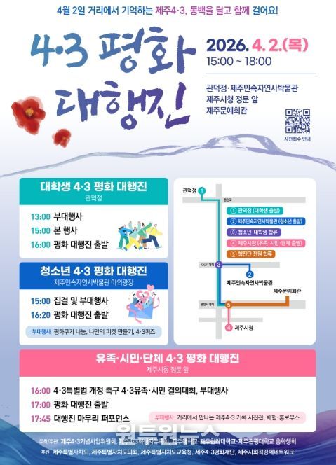 이번 대행진은 같은 날 저녁 제주문예회관에서 열리는 4·3 전야제와 연계해 진행된다. 참가 신청은 행사 포스터의 큐알(QR)코드 접속 또는 이메일을 통해 할 수 있으며, 문의는 ㈔제주4·3기념사업위원회로 하면 된다.