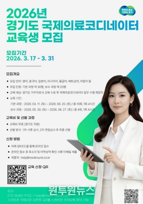 (원투원뉴스) 경기도가 외국인환자 유치 활성화와 국제의료 경쟁력 강화를 위해 ‘2026년 국제의료코디네이터 교육’ 교육생을 모집한다.
