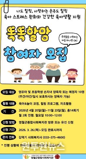 (원투원뉴스) 영월군종합사회복지관은 손자녀를 양육하는 보호자의 육아 스트레스 완화와 건강한 양육 환경 조성을 위해 프로그램 ‘똑똑할맘’ 참여자를 모집한다.