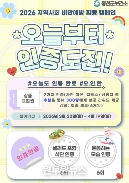 원은숙 홍천군보건소장은 “비만 예방은 일상 속 작은 습관의 변화에서 시작된다”라며 “매일의 꾸준한 인증을 통해 군민 스스로 건강한 생활 습관을 형성하는 계기가 되길 바라며, 작년보다 혜택 대상을 대폭 확대한 만큼 많은 관심과 참여를 부탁드린다”라고 말했다.