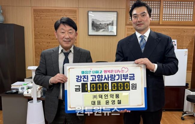 (원투원뉴스) (주)덕인약품 윤영철 대표와 도암면 장촌마을 이장 김영곤 씨의 자녀 김영미·김재경 씨가 강진의 따뜻한 변화를 응원하며 소중한 온정을 더했다.