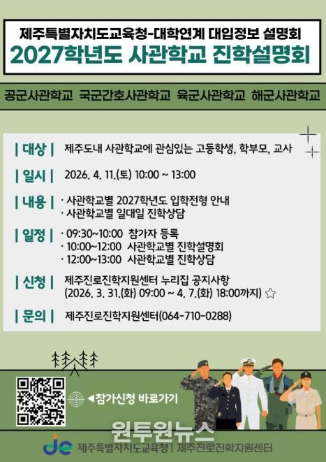 (원투원뉴스) 제주특별자치도교육청은 정예 장교를 꿈꾸는 도내 수험생에게 진학 정보를 제공하기 위해 ‘제주특별자치도교육청-사관학교 연계 2027학년도 진학설명회’를 4월 11일 오전 10시 제주특별자치도교육청 본관 4층 대회의실에서 개최한다.