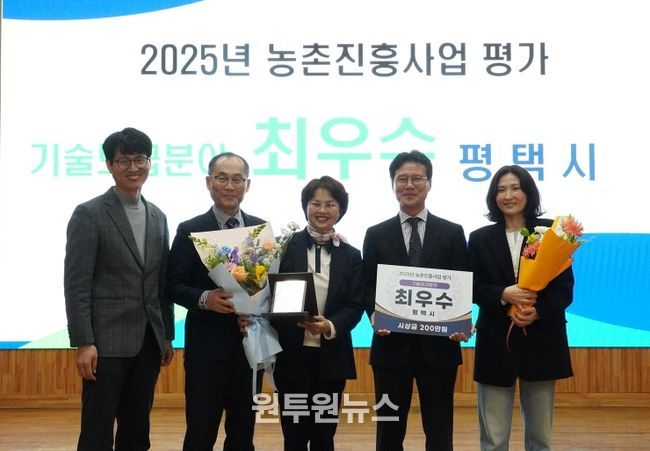 (원투원뉴스) 평택시농업기술센터는 경기도농업기술원이 주관한 '2025년 농촌진흥사업 평가’기술보급 분야에서 최우수 기관으로 선정되어, 지난 26일 경기도농업기술원에서 최우수상을 받았다고 밝혔다.