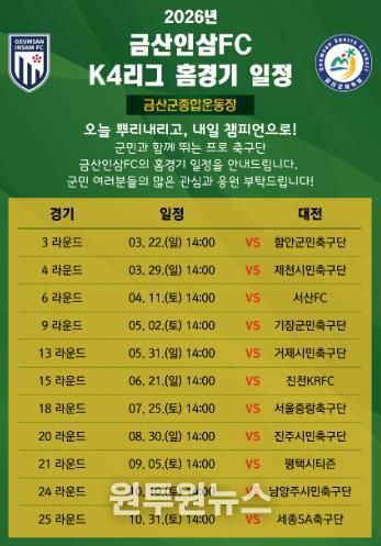 (원투원뉴스) 금산인삼에프씨는(FC)는 2026 시즌 케이(K)4리그 안방 사수를 위한 홈경기 일정을 전격 안내에 나섰다.