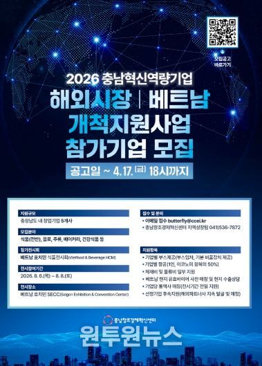(원투원뉴스) (재)충남창조경제혁신센터는 2026년 충남 혁신역량기업 해외시장개척 지원사업(베트남)에 참여할 충남도내 창업기업 5개사를 오는 4월 17일까지 모집한다고 밝혔다.
