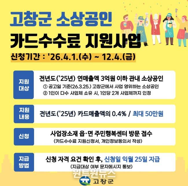 (원투원뉴스) 고창군이 관내 소상공인의 경영 부담 완화를 위해 오는 4월1일부터 예산 소진 시까지 ‘2026년 소상공인 카드수수료 지원사업’을 본격 추진한다고 밝혔다.