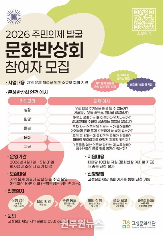(원투원뉴스) 고성문화재단은 주민 스스로 지역의 문제를 진단하고 대안을 모색하는 2026 주민의제 발굴 '문화반상회' 참여 모임을 오는 4월 1일 수요일부터 5월 31일 일요일까지 모집한다.