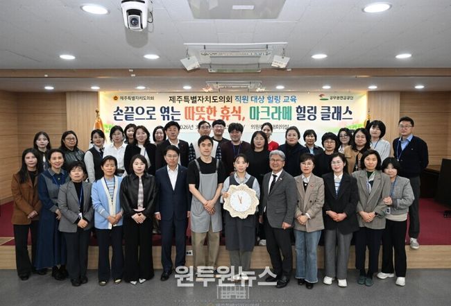 (원투원뉴스) 제주특별자치도의회는 31일 오후 의원회관 대회의실에서 사무처 직원 40명을 대상으로 심신 안정과 직무 스트레스 해소를 위한 ‘직원 힐링 교육: 마크라메 원데이 클래스’를 개최했다.
