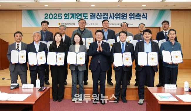 (원투원뉴스) 전북특별자치도의회 문승우 의장은 31일 도의회 의원총회의실에서 2025회계연도 결산검사위원 위촉장을 수여했다.