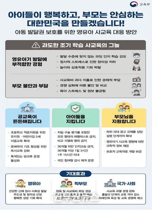 (원투원뉴스) 교육부)는 4월 1일‘아동 발달권 보호를 위한 영유아 사교육 대응 방안’을 발표한다. 이는 ‘4세·7세 고시’ 현상 등 비정상적으로 확장된 영유아 사교육 시장을 바로잡고, 과도한 조기 경쟁과 선행 학습으로 인한 발달 저해, 정서적 부담 가중 등 아동학대적 양상까지 나타나는 상황에 대응하기 위해서이다.