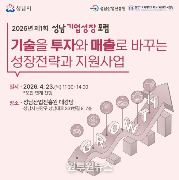 (원투원뉴스) 성남산업진흥원은 4월 23일 11시 30분부터 성남산업진흥원 대강당에서 '2026년 제1회 성남기업성장포럼'을 개최한다. 이번 행사는 기술 기반 투자유치와 중동사태 대응 방안을 중심으로 성남 기업의 매출 성장과 글로벌 진출을 모색한다.