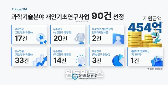 이는 지난해 63건, 319억 894만여 원에 비해 건수로는 27건(42.9%), 금액으로는 135억 1860만여 원(42.4%) 증가한 것으로 경상국립대학교의 기초연구의 방향과 우수연구자 양성 전력, 연구역량 등이 전반적으로 인증받은 결과로 풀이된다(2025년 대비 2026년도 사업 유형이 일부 개편됐으나, 유사 유형 기준으로 재분류하여 정리).