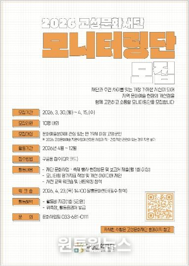 (원투원뉴스) 평화 경제 거점 도시 강원 고성군 산하 고성문화재단은 재단이 추진하는 문화예술사업에 대한 군민 의견을 반영하고 사업 환류 체계를 강화하기 위해 ‘2026 고성문화재단 모니터링단’을 모집한다. 이번 사업은 군민 참여 기반의 현장 소통을 확대하고, 문화예술사업 운영의 투명성과 책임성을 높이기 위해 마련됐다.